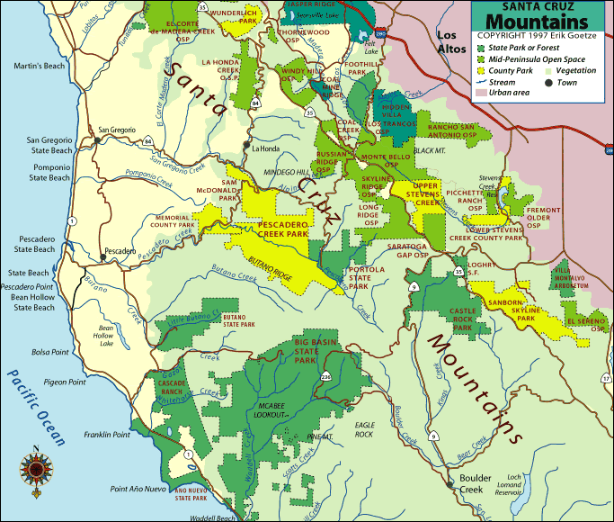 Map of the Northern Santa Cruz Mountains area showing parks with panoramas